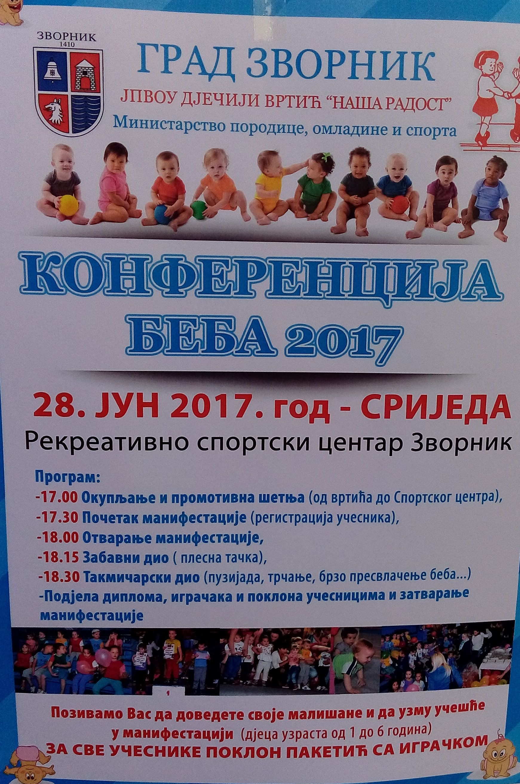 U srijedu 28. juna 2017. godine biće održana Konferencija beba u Rekreativno-sportskom centru Zvornik sa početkom u 17h.