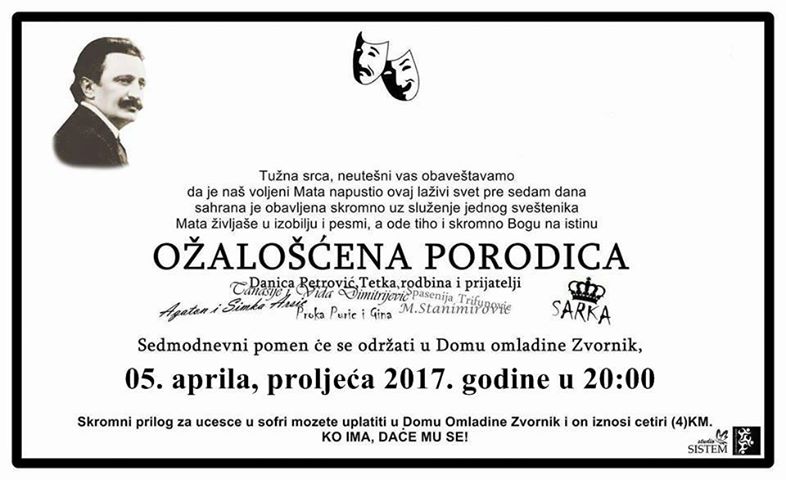 Pozorišna predstava Ožalošćena porodica biće izvedena 05. aprila u Domu omladine Zvornik. Predstava počinje u 20h, a cijena ulaznice je 4KM.