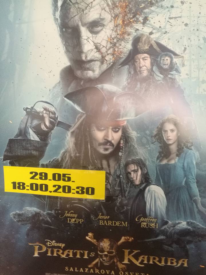 Projekcija “Pirati sa Kariba” je na programu 29.05. 2017. u Domu omladine. Planirana su dva prikazivanja u 18h i u 20h 30minuta. Karte se mogu kupiti svaki dan (osim nedelje) u periodu od 10h do 18h.