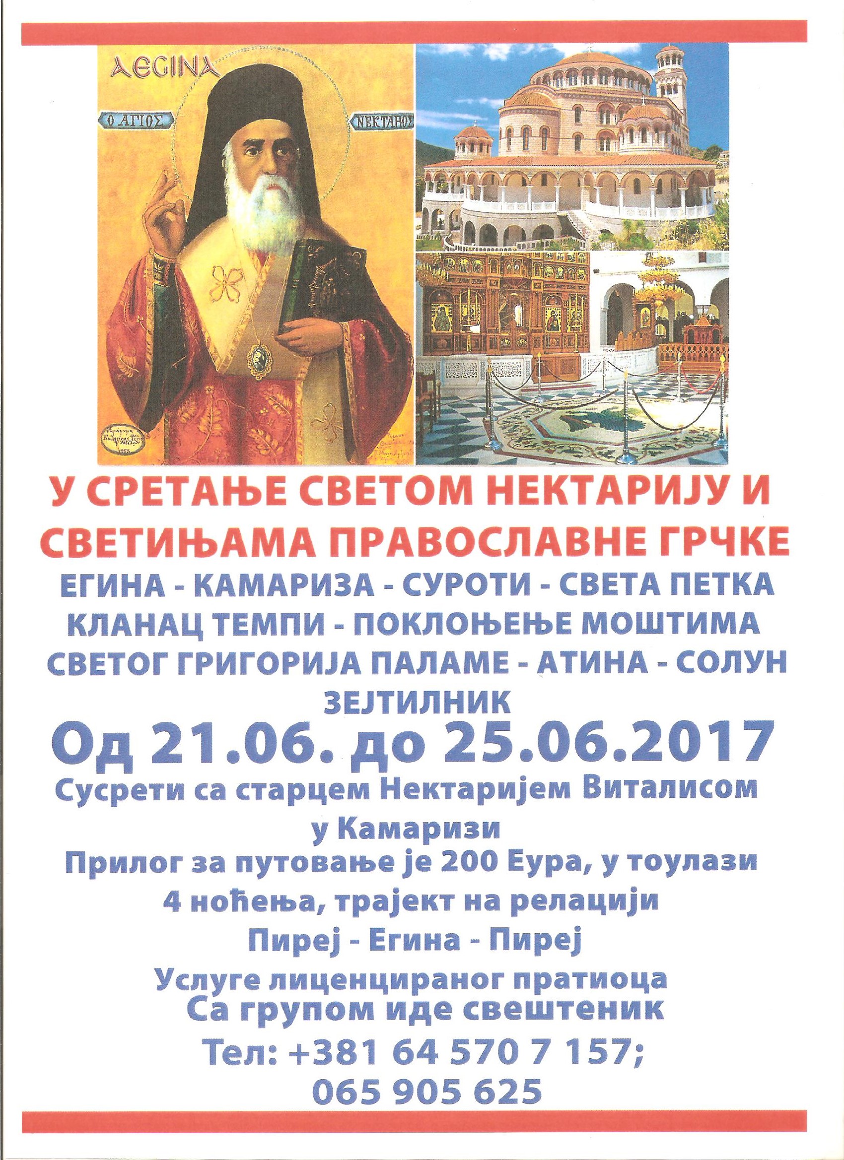 U periodu od 21. do 25. juna biće organizovano putovanje “U sretanje Svetom Nektariju i svetinjama pravoslavne Grčke”. Cijena putovanja je 200 evra (4 noćenja, trajekt na relaciji Pirej-Egina-Pirej, usluge licenciranog pratioca). Više informacija na +381 64 570 7 157; +387 65 905 625