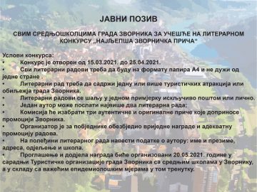Turistička organizacija grada Zvornika je raspisala Literarni konkurs „Najljepša zvornička priča“ za djecu srednjoškolskog uzrasta. Konkurs je otvoren do 25. aprila 2021. godine. Ideja konkursa je da se promovišu turističke atrakcije, da se podstaknu djeca da razmišljaju o svom gradu i da kroz radove osmisle prave riječi i razloge zašto baš Zvornik treba da bude posjećen od strane drugih. Ovo je prilika kako za promociju grada, promociju škole i promociju pravih školskih vrijednosti. Učešćem na konkursu srednjoškolci će dati svoj doprinos u promociji grada, a oni najkreativniji će osvojiti vrijedne nagrade.