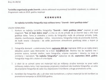 Od 01.01.2019. godine Turistička organizacija grada Zvornika raspisuje fotografski konkurs „Zvornik – četiri godišnja doba“ pod sloganom “Sve mi boje dobro stoje”. Fotografije pristigle na konkurs imaju cilj da prikažu da je Zvornik lijep u bilo koje godišnje doba. Tema je slobodna u smislu da fotografija može da prikazuje prirodu, ljude, objekte, manifestacije, događaje i slično.  Istovremeno, fotografija treba da promoviše Zvornik, da bude vesela i živopisna i da odiše pozitivnom atmosferom godišnjeg doba u kojem je snimljena. U obzir će se uzimati materijali koji do sada nisu korišteni u druge propagandne kampanje. Fotografije će moći biti u koloru ili crno bjele, a veličina mora biti najmanje 300 dpi. Fotografije slati isključivo putem sajta WeTransfer na e-mail adresu: tooz@teol.net. Nagradni fond za četiri najbolje turističke fotografije iznosi 200, 150, 100 i 50 konvertibilnih maraka. Konkurs će biti otvoren od 01.01.2019. do 21.09 2019. godine i predstavlja priliku za sve one koji vole fotografiju i koji se bave njom profesionalno ili iz hobija da pokažu svoju kreativnost. Nagrađene fotografije biće korištene u promotivne svrhe za sezonu 2019/20, što predstavlja promociju i grada ali i autora tih fotografija. Molimo vas da pažljivo pročitate kompletan tekst konkursa kako biste pravilno aplicirali na konkurs. Tekst konkursa:konkurs 2019