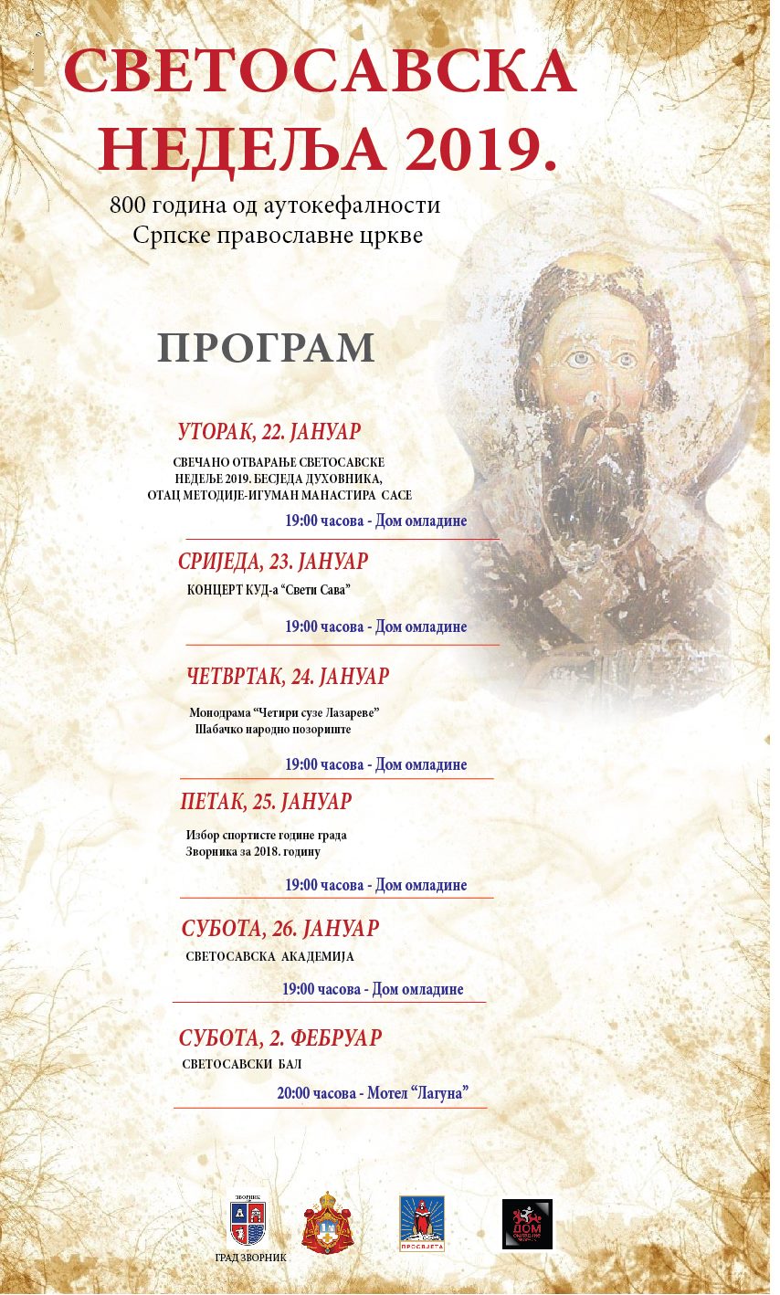 Prema programu obilježavanja “Svetosavske nedelje” u srijedu, 23. januara planiran je koncert Kulturno-umjetničkog društva „ Sveti Sava“ Zvornik u Domu omladine sa početkom u 19 časova, a narednog dana Šabačko narodno pozorište će izvesti monodramu „Četiri suze Lazarove“ u istom terminu. U petak, 25. januara, biće održan izbor sportiste godine, a u subotu, 26. januara Svetosavska akademija na kojoj će besjediti istoričar Željko Vujadinović.